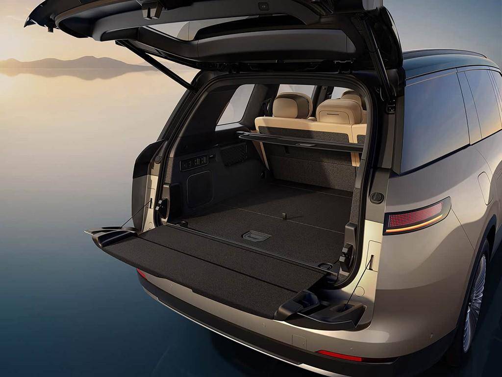 大五座版的核心杀手锏在于:取消了第三排后,二排腿部空间拉满至1120mm,同时标配全座椅腿托和电动调节,后排舒适性跃升了一个维度;后备厢常规容积显著扩大,并支持电动一键放倒后排座椅,天地门地门可承重300kg,实用性直接对标户外露营场景。新增日冕金配色搭配金色多条辐轮毂与红色卡钳,在视觉上也完成了差异化区隔。